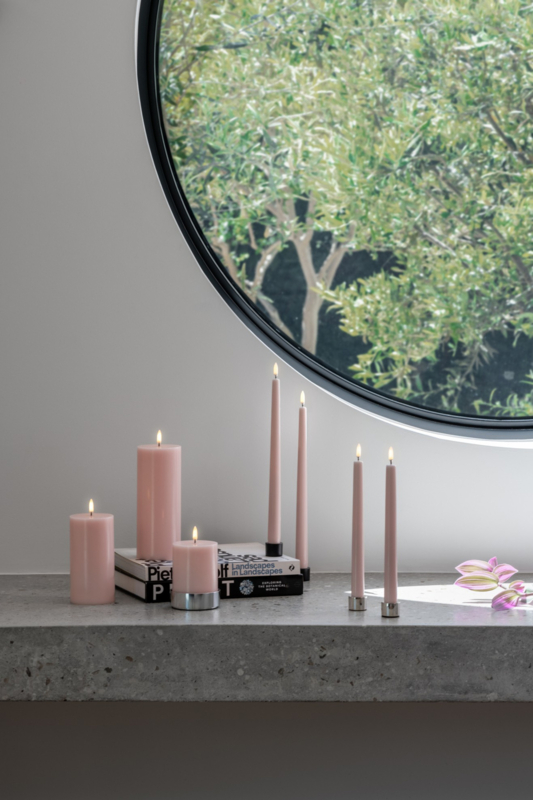 De kaars is gemaakt van echte was en heeft een luxe uitstraling in de elegante kleur Rose Powder, perfect voor een sfeervol interieur.